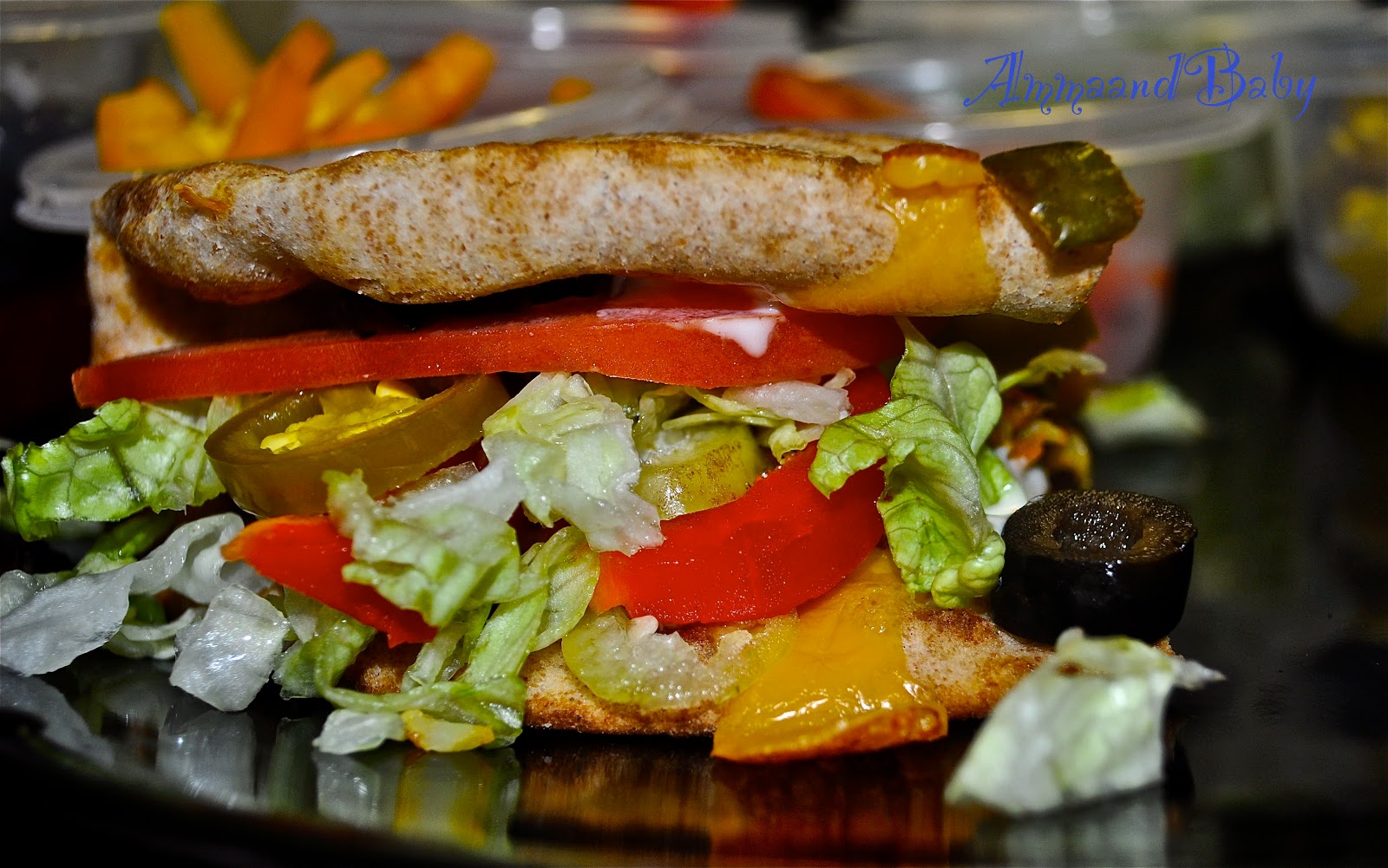 Now layer it up and order as per your choice of veggies. For Omy, I added lettuce, patty , olives, cheese, and mayo.. he loved it to bits.